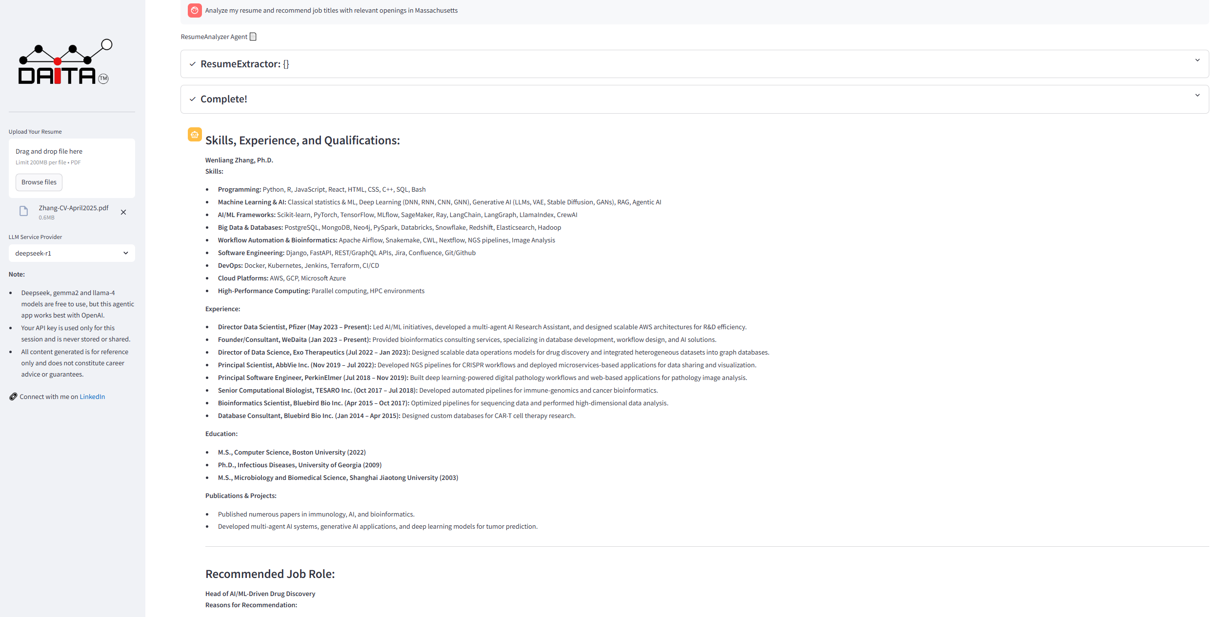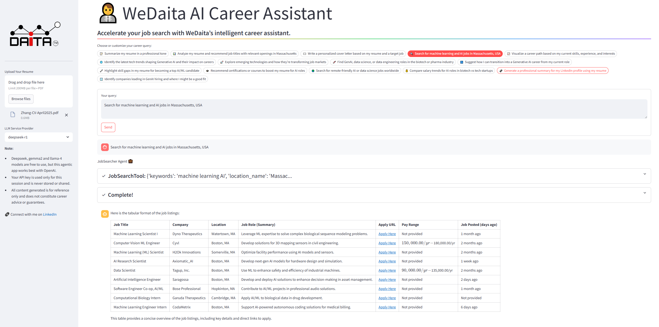 WeDaita AI Career Assistant is a multi-agent application that streamlines the job search process. It uses a team of specialized AI agents to help users discover relevant opportunities, analyze resumes, generate tailored cover letters, and provide career insights. Designed for clarity and ease of use, the platform supports job seekers with practical, AI-powered tools. Explore it at https://careerassist.wedaita.com.