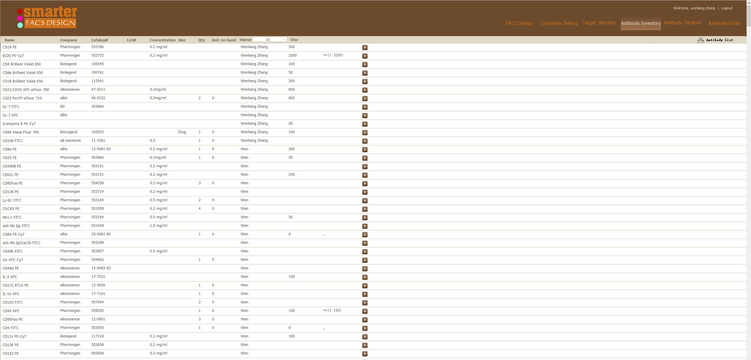 Smarter FACS is an advanced database application designed to streamline the management of FACS antibodies in research laboratories. It not only facilitates efficient tracking of antibodies but also offers an automated feature for designing FACS panels. Leveraging information on staining targets, available antibodies, and Flow Cytometry configurations, it can intelligently generate optimal panel designs. Furthermore, the application can calculate the required volumes for each antibody based on titration data, enhancing precision in experimental planning.